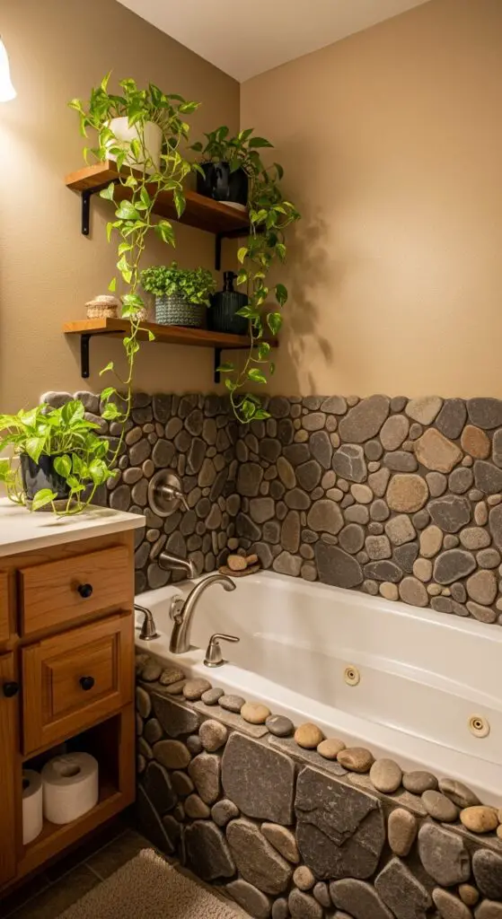 Install peel-and-stick stone veneer panels made from sustainable materials to convert plain walls into rugged cliff faces. These natural textures add depth while remaining budget-friendly and renter-friendly.