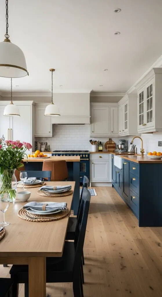 Balance this with ambient lighting through recessed ceiling fixtures or track lighting that evenly distributes general illumination. Add a statement chandelier or pendant cluster above your dining table to define the eating area while creating visual interest that complements your kitchen’s aesthetic.