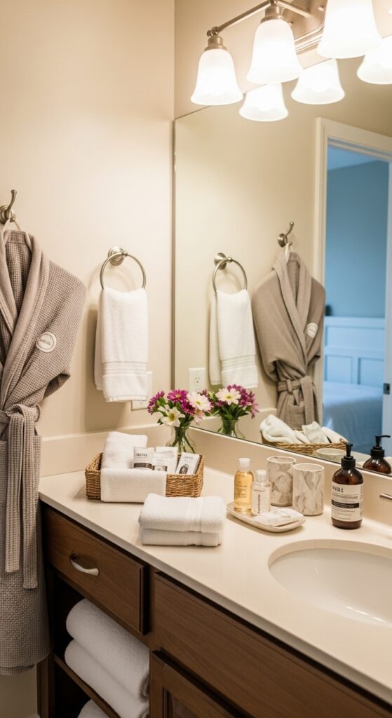 Consider adding practical touches like a basket with travel-sized essentials, fresh flowers, or a small tray with mints. Install hooks for robes and provide extra toilet paper in an attractive holder. These simple additions demonstrate genuine hospitality and guarantee your guests feel indulged during their stay.
