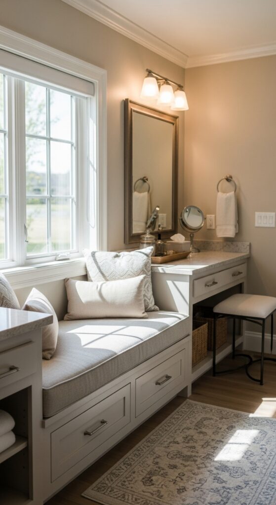 A comfortable seating area alters your guest bathroom from a purely functional space into an inviting retreat where visitors can relax and prepare with ease. Consider adding plush ottoman seating near your vanity for a luxurious touch that doubles as storage space. Position a cushioned bench beneath windows to create a peaceful spot for guests to sit while applying makeup or skincare.