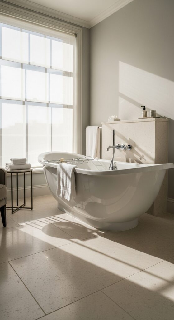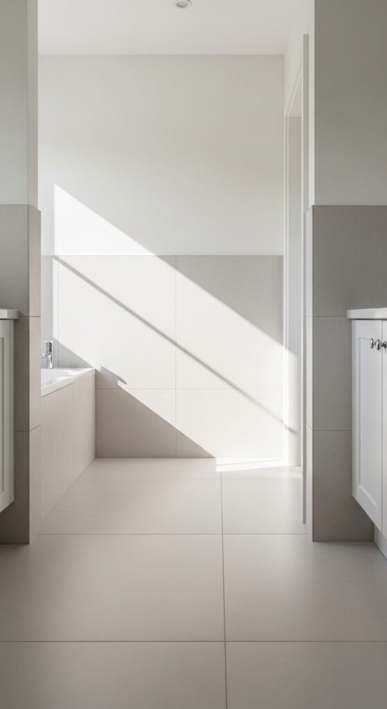 Install large format tiles in neutral tones like warm whites or soft grays to amplify the airy atmosphere. Consider running floor tiles up the wall partially to blur boundaries and create continuous flow that makes your bathroom feel boundlessly spacious. When selecting your tile design, prioritize both aesthetic appeal and functional benefits to create a guest bathroom that serves your visitors’ needs while maintaining visual impact.