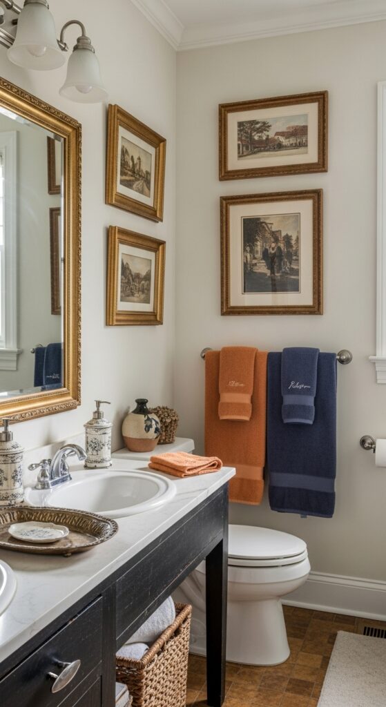 Add personal artwork like framed photography or small paintings that complement your color scheme without overwhelming the space. Incorporate family heirlooms such as vintage vanity trays, antique soap dispensers, or decorative bowls that tell your story.