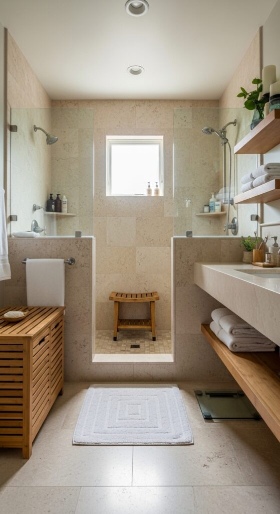 Use natural wood furnishings like teak shower benches, bamboo storage towers, or reclaimed wood floating shelves to warm the atmosphere. These elements contrast beautifully against cool tile surfaces while providing functional storage solutions that enhance your bathroom’s spa-like ambiance.