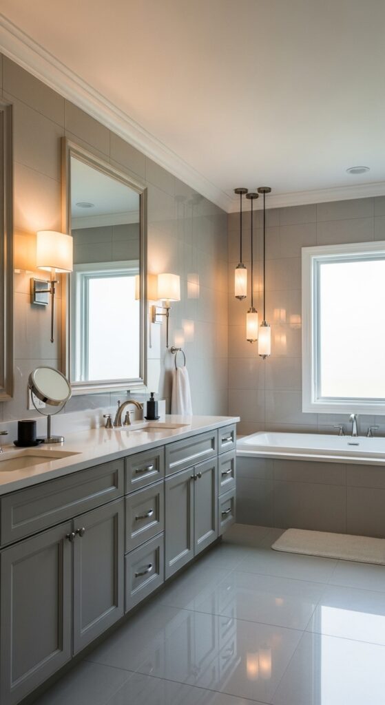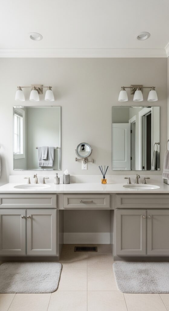 Double vanities work best when spaced 30-36 inches apart, giving each person adequate elbow room. Incorporate custom cabinetry for added storage beneath each sink area. Consider installing individual mirrors and lighting fixtures above each vanity section. This thoughtful arrangement lets multiple guests prepare simultaneously without crowding or inconvenience.
