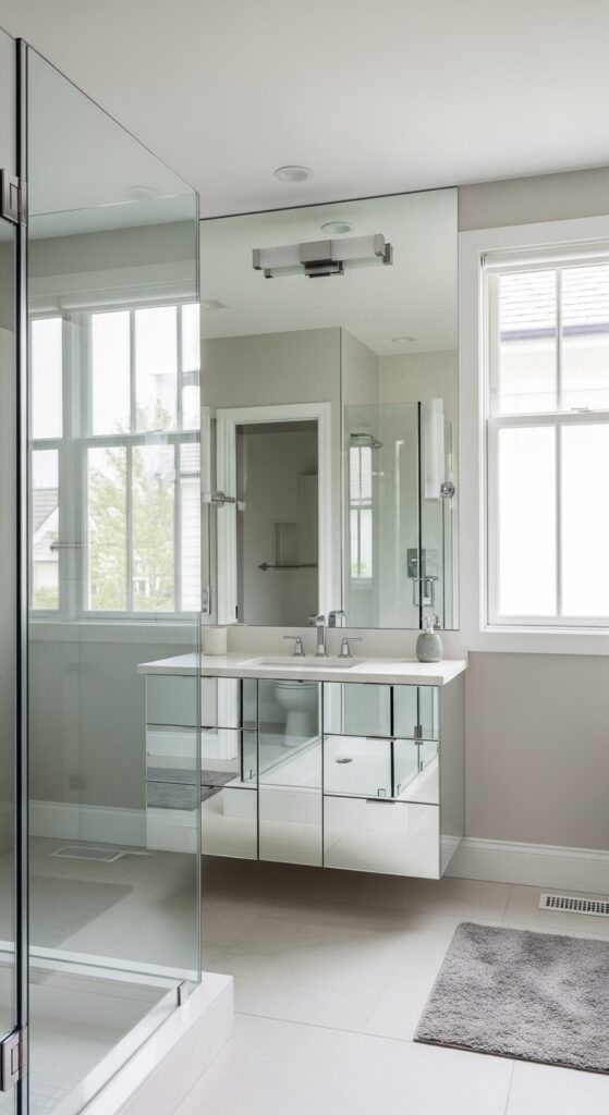 Consider installing mirrored medicine cabinets that serve dual purposes while expanding visual space. You can mount oversized mirrors from floor to ceiling, creating dramatic height perception. Frameless options work best in compact areas, eliminating visual boundaries. Multiple smaller mirrors arranged thoughtfully can scatter light beautifully while adding design interest to plain walls.