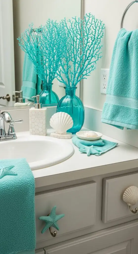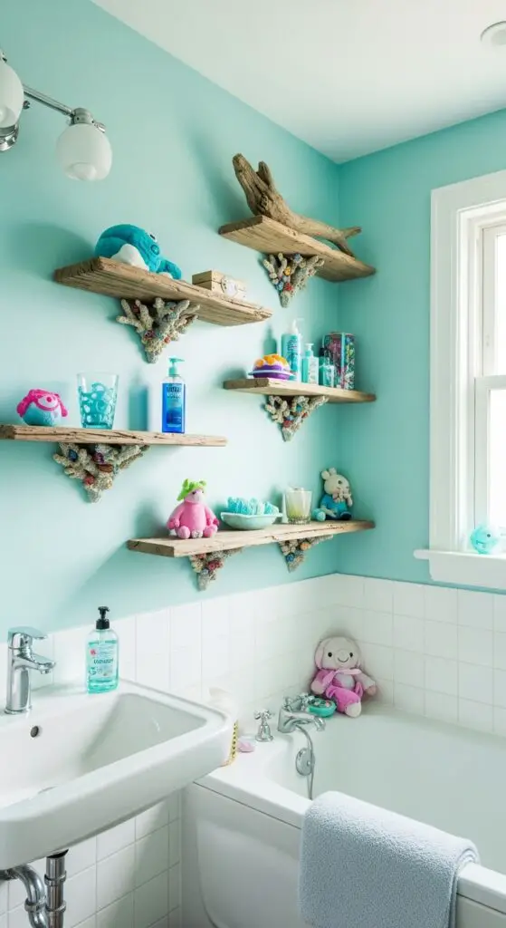 Incorporate lively coral reef sculptures as shelf brackets or decorative elements. These colorful additions bring life to your underwater paradise while offering practical storage for towels and bathroom essentials.