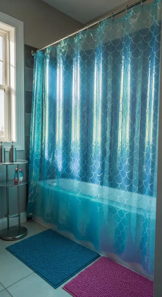 When you hang an iridescent shower curtain in your mermaid-themed bathroom, you’ll instantly create a focal point that captures and reflects light like ocean waves. Choose iridescent shower curtains that catch the light from multiple angles, altering your ordinary bathroom into an underwater paradise.