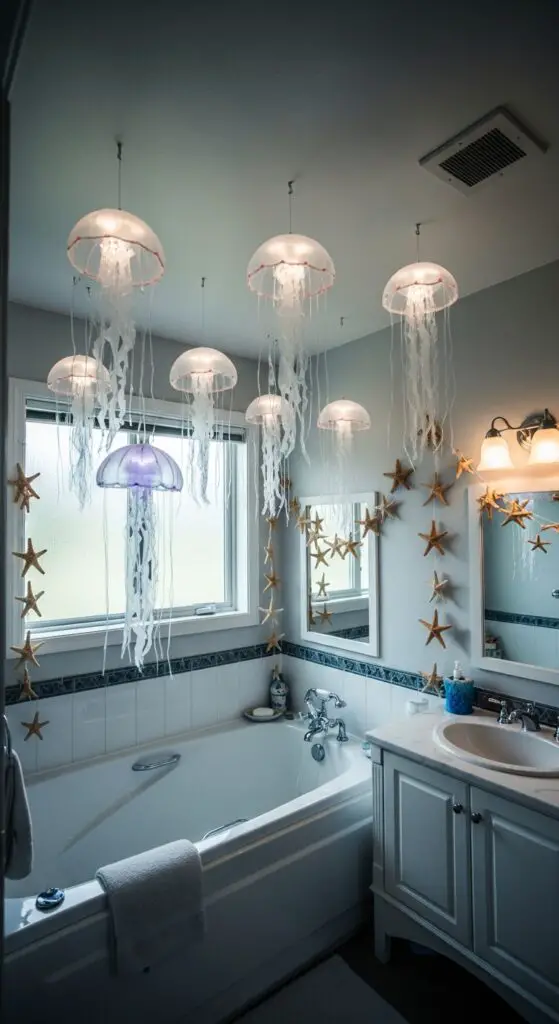 Complement your jellyfish with fanciful starfish garlands draped across walls or around mirrors. Choose lightweight materials like felt, paper, or foam that won’t damage surfaces. These hanging decorations give your child’s bathroom dimensional interest while maintaining that dreamy, ocean-escape atmosphere you’re creating.