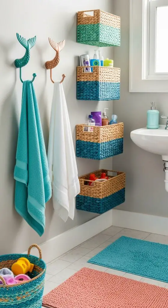 Mermaid inspired storage baskets organize bath toys, toiletries, and washcloths efficiently. Select woven seagrass or rope options in ocean hues. Wall-mounted basket combinations maximize floor space while keeping essentials within reach. Consider installing multiple hooks at different heights to create an accessible organization system that grows with your child.