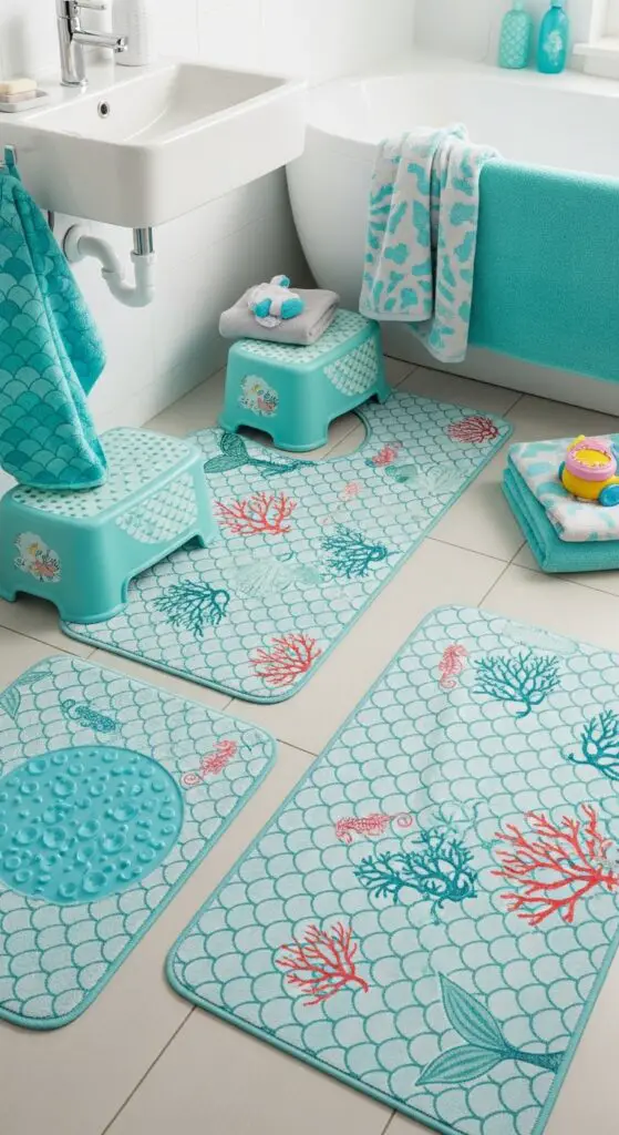 Creating beautiful underwater lighting sets the foundation for your mermaid bathroom, but selecting the right bath mats and non-slip rugs completes the oceanic theme while ensuring your child’s safety on wet surfaces. Choose coordinated bath mats featuring scales, seahorses, or coral patterns that match your color scheme. Look for mats with strong suction cups underneath to prevent slipping during bath time.