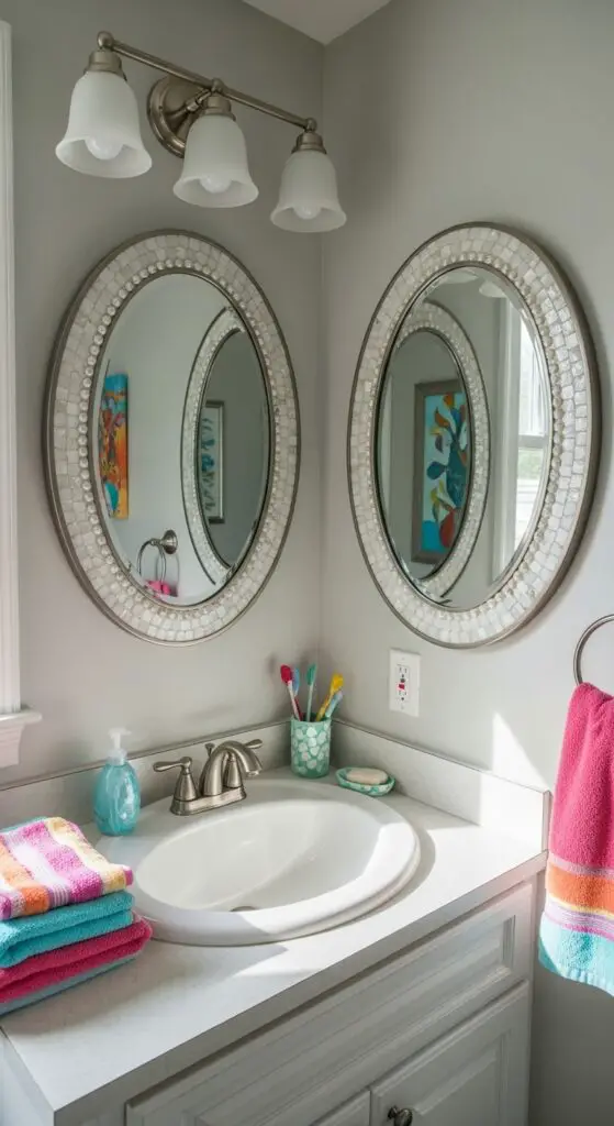 Your bathroom’s vanity area becomes a true mermaid’s treasure when you install mirrors adorned with lustrous pearl accents that reflect both light and your child’s imagination. Choose circular or oval mirrors framed with genuine mother of pearl accents for authentic ocean shimmer. These decorative elements catch natural light beautifully, creating dancing reflections throughout the space.