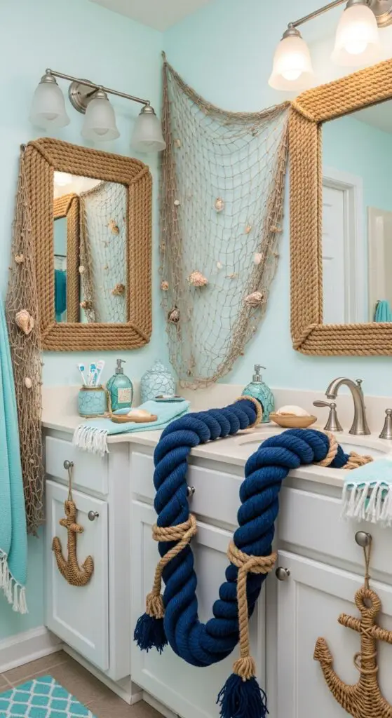 You’ll metamorphose ordinary spaces by draping fishing nets across corners and wrapping thick rope around mirror frames. Navy blue tasseled ropes create stunning towel holders when mounted on walls with brass hooks. Install woven anchor motifs alongside rope-wrapped cabinet handles for cohesive maritime charm.
