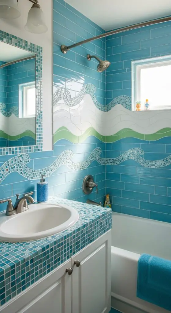 Consider mosaic tiles for detailed wave crests or larger format tiles for bold, sweeping movements that make your bathroom feel like an enchanting ocean paradise.