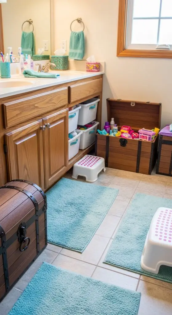 Choose wooden chests with waterproof finishes or plastic treasure boxes featuring nautical hardware details. Position larger chests beneath vanities for bulky items, while smaller containers hold bath toys near the tub. Install wall-mounted treasure chest organization units to maximize floor space and create visual interest.