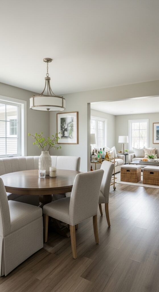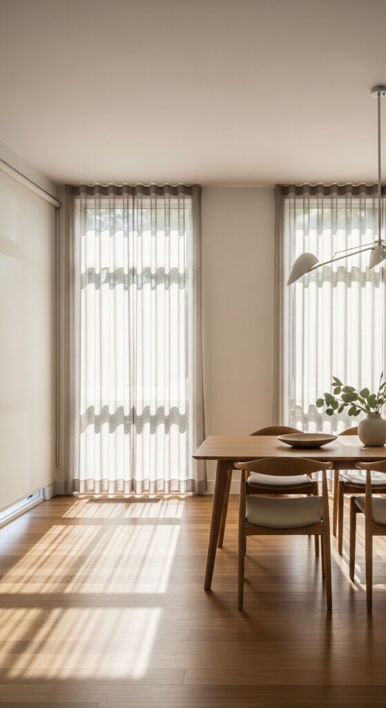 Maximize natural light with simple window shades featuring neutral colors and minimal hardware. Roller shades in white or cream create unobstructed views when raised completely. For softer illumination, employ translucent window treatments for airy ambiance throughout your meals.