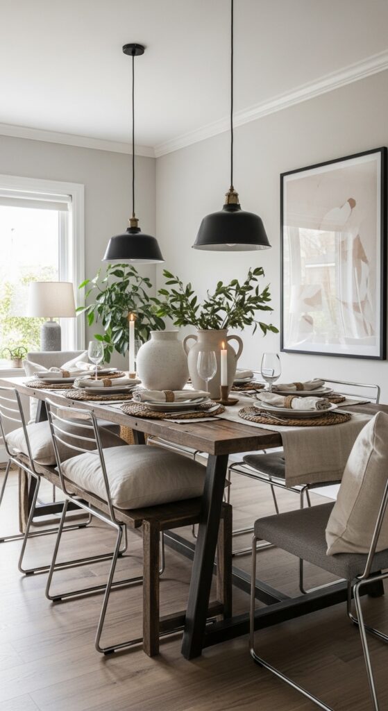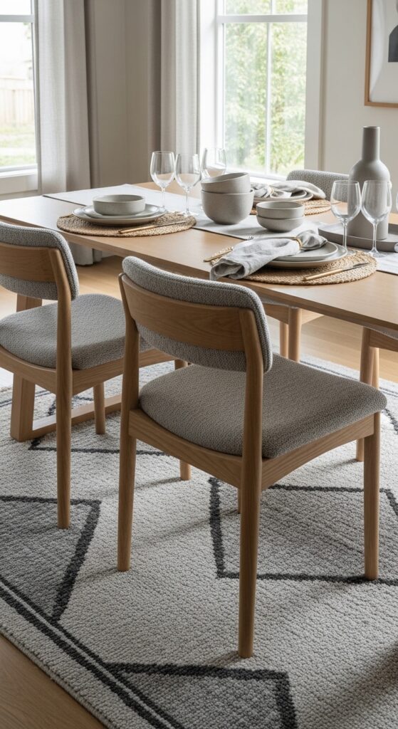 Experiment with chair upholstery using linen, wool, or textured cotton fabrics in neutral tones. A mix of natural materials works beautifully—combine jute placemats with smooth ceramic dishes, or pair rough-hewn wooden chargers with polished glassware. These contrasting textures create visual interest while maintaining your room’s sophisticated, uncluttered appeal.