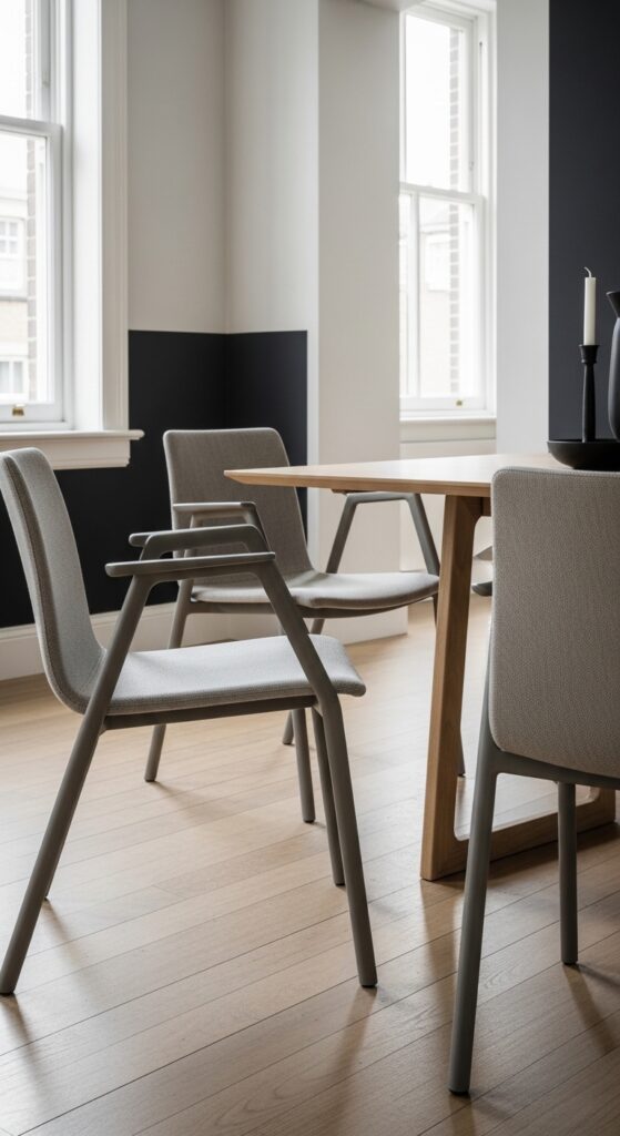 Look for designs featuring sculptural armrests that double as artistic elements while supporting your guests during longer dinner conversations. Choose chairs with curved backrest profiles that follow your body’s natural contours, ensuring comfort meets contemporary style.