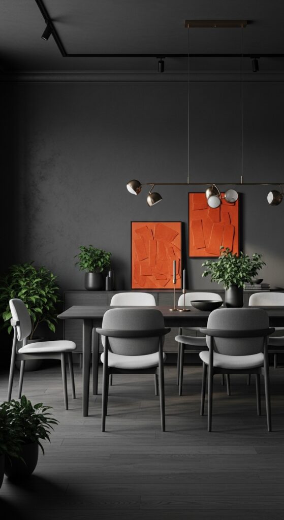 Consider charcoal gray walls paired with lighter gray upholstery and dark wooden accents. A timeless black and white palette creates sharp, modern contrast that instantly elevates any dining room design. Then introduce restrained accent colors through carefully chosen elements like brass lighting fixtures, emerald green plants, or burnt orange artwork. This approach lets you maintain design freedom while ensuring every element works harmoniously together, creating depth without overwhelming your modern aesthetic.