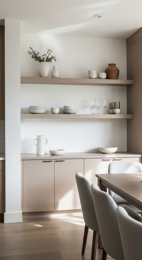 Floating shelves create visual lightness while displaying your favorite dishes and decorative pieces without overwhelming the space.