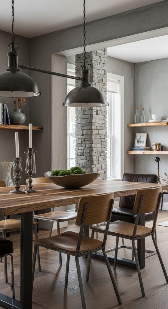 While modern dining rooms often rely on uniform finishes, you’ll achieve striking visual depth by thoughtfully combining concrete, steel, and natural wood elements throughout your space. Incorporate reclaimed wood dining tables to add warmth against cool concrete accent walls or polished floors. Highlight unfinished metals through industrial pendant lighting, steel chair frames, or raw iron table bases that showcase authentic patina and welding marks.