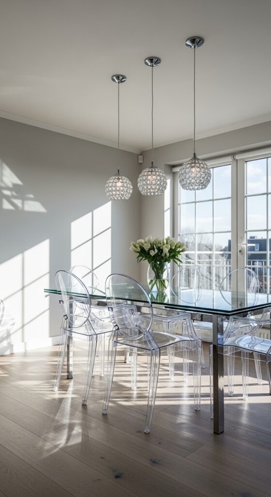 Use reflective glass tabletops to bounce light around the room and visually expand your square footage. Clear chairs disappear into the background, allowing your eye to travel unobstructed across the space. Incorporate transparent room dividers instead of solid walls to maintain flow between areas while defining separate zones. Glass pendant lights add sparkle without visual weight, keeping your ceiling feeling high and spacious.