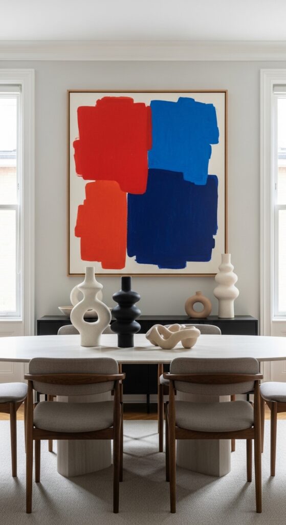 Large-scale abstract art alters blank dining room walls into commanding visual statements that anchor your modern space with bold sophistication. Choose pieces that span at least 36 inches to create proper visual weight against your dining table and chairs.