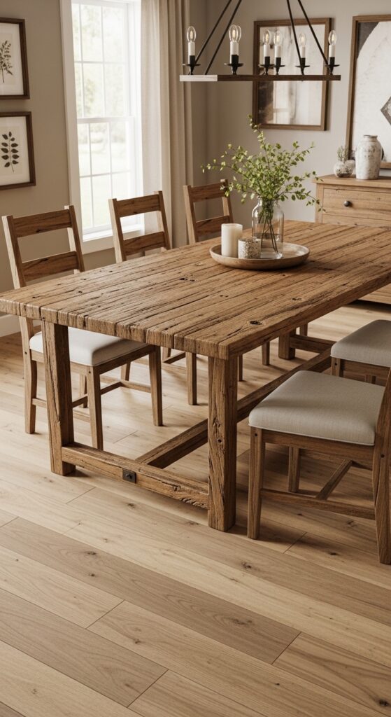 Distressed wood finishes add character while maintaining the polished look you want for entertaining guests. Look for pieces featuring weathered planks, metal accents, or industrial-style legs that blend rustic charm with contemporary functionality. These reclaimed wood accents create visual warmth and establish the foundation for layering additional farmhouse elements throughout your dining area. For larger dining spaces, consider chunky wooden tables that make a bold statement while providing ample room for family gatherings and entertaining.