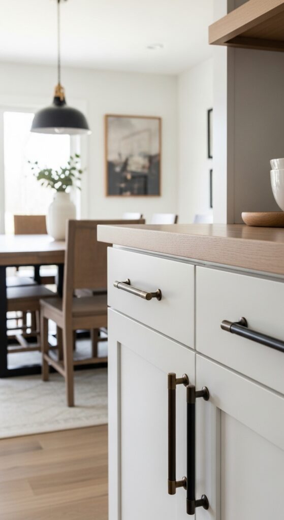 Matte black hardware creates bold contrast against light wood and white cabinetry, adding contemporary edge to traditional elements.