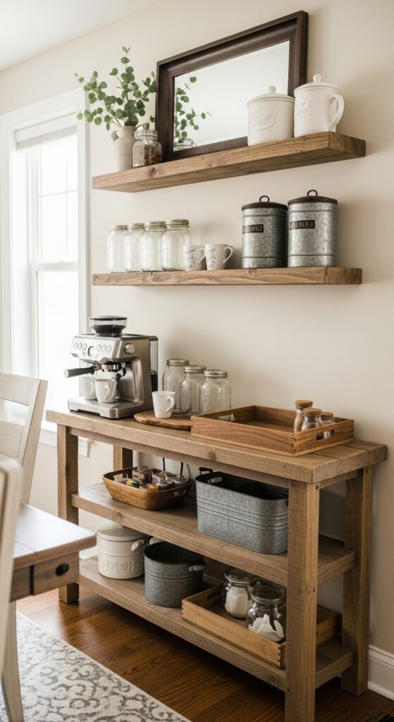 Install a counter top barista station on a rustic console table, complete with your espresso machine and milk frother. Add galvanized metal containers for sugar and cream alongside weathered wooden trays for mugs. This setup encourages guests to help themselves while you focus on hosting, creating the perfect blend of hospitality and independence.