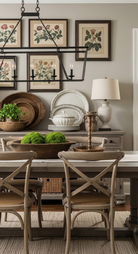 Antique serving pieces double as functional art when you’re not entertaining guests. Display pewter platters, vintage cake stands, and weathered wooden bowls on open shelving or sideboards. These pieces tell stories while adding texture and warmth that perfectly complement your farmhouse aesthetic.