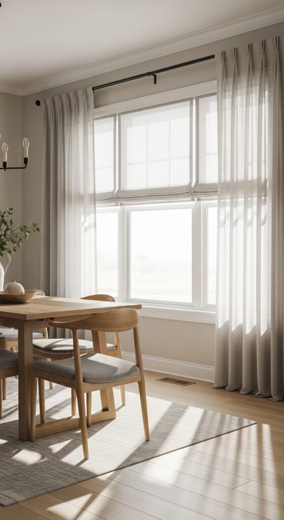 Consider Roman shades in natural fabrics for clean lines that won’t overwhelm your space. Layer treatments by pairing valances with blinds, allowing you flexibility to control light throughout different times of day.