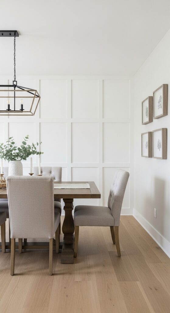 Board and batten patterns offer vertical emphasis that draws the eye upward, making your dining room feel more spacious and grand.