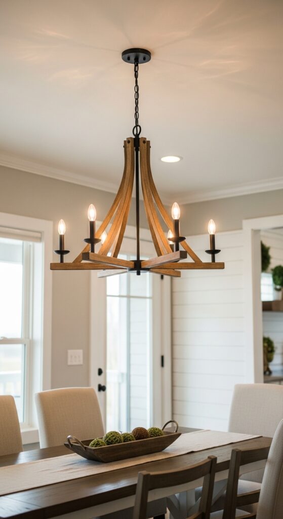 Consider rustic industrial lighting options like wrought iron chandeliers with wooden accents or pendant lights featuring reclaimed wood details. These fixtures create focal points that draw the eye upward while providing functional illumination for family meals and entertaining guests. A well-chosen chandelier design serves as a brilliant centerpiece that elevates your entire dining room ceiling while maintaining the cozy farmhouse atmosphere.