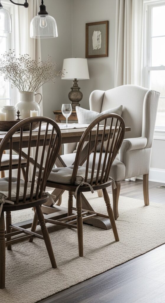 Mix weathered wooden chairs with upholstered benches to create visual interest while maintaining comfort during long dinner conversations. Prioritize ergonomic comfort by selecting pieces with proper back support and seat depth. Consider reupholstering antique finds with durable, family-friendly fabrics that withstand daily use while preserving their authentic character and timeless appeal. Create an authentic vintage atmosphere by incorporating antique finds alongside retro styling elements that enhance your dining room’s nostalgic character.