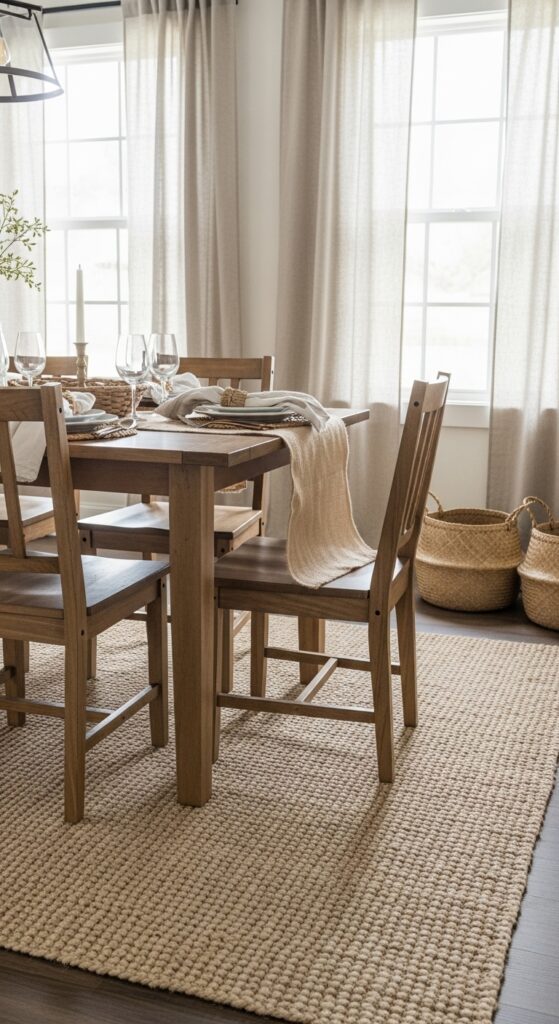 Natural textures breathe life into your modern farmhouse dining room by creating visual interest and tactile warmth that guests can’t help but notice. Layer a jute or sisal rug beneath your dining table to anchor the space with earthy appeal.
