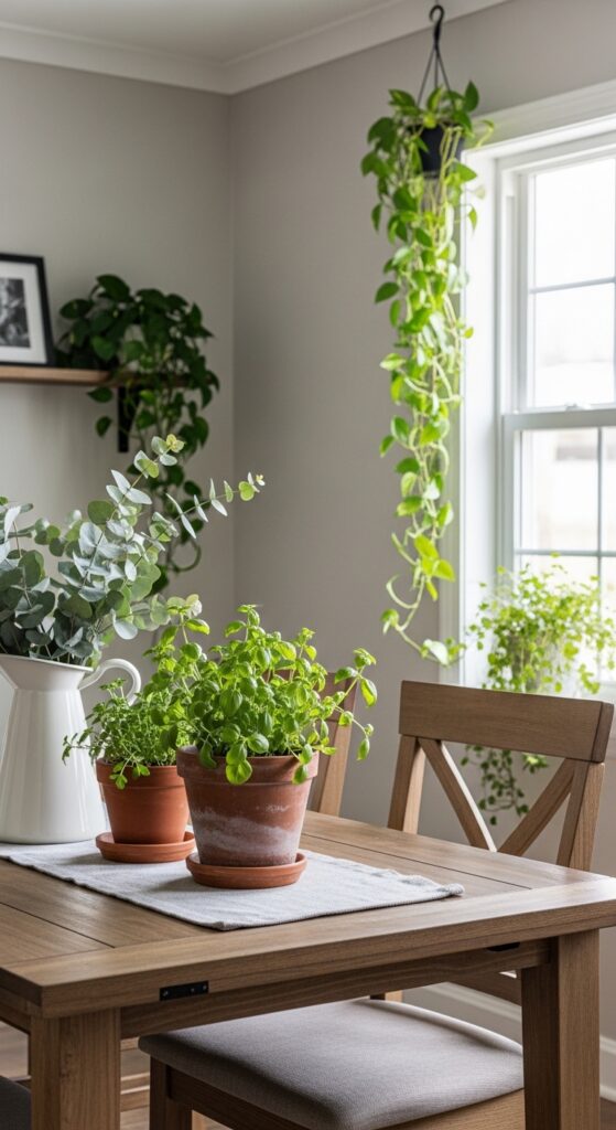While hardwood and neutral tones create your farmhouse foundation, living plants alter your dining room into a space that feels fresh and inviting year-round. Position potted herbs like rosemary or lavender on your dining table for natural fragrance and cooking convenience. Hanging plants from exposed beams or ceiling hooks add vertical interest without consuming precious floor space. Consider eucalyptus, pothos, or trailing ivy for low-maintenance options.
