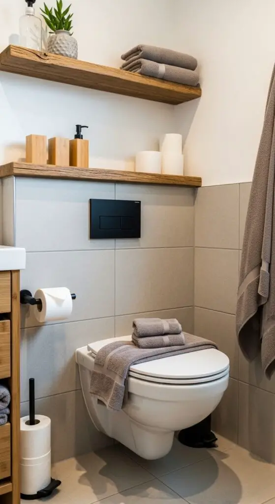 Install reclaimed wood shelving above your toilet or beside your vanity for functional storage with character. These weathered planks add instant personality while maintaining clean lines.