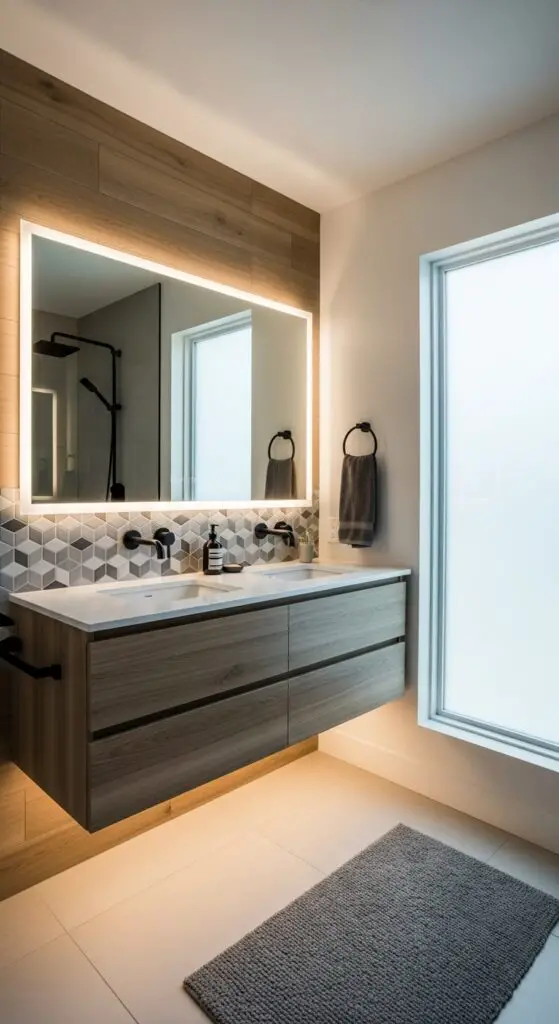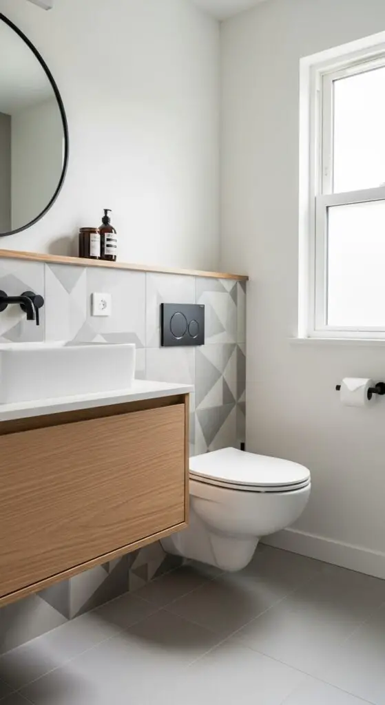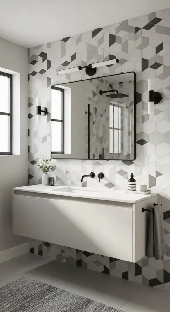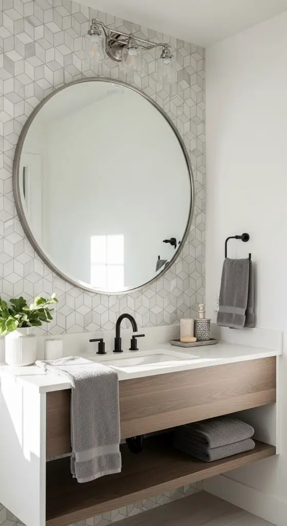 Geometric tiles transform plain bathroom walls into sophisticated focal points without overwhelming your guest bathroom’s modern aesthetic. You’ll uncover that hexagons, diamonds, and triangular patterns create visual depth while maintaining clean lines essential for contemporary design.