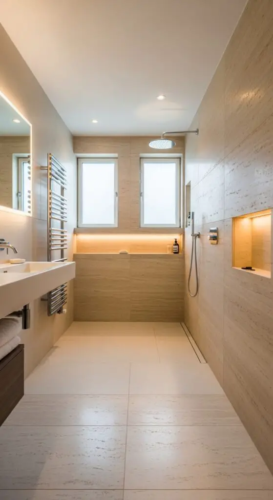 Simplicity reaches its peak when you adopt a wet room design that eliminates traditional shower enclosures and creates one continuous waterproof space. You’ll create a walk in shower design that flows seamlessly with the rest of your bathroom, maximizing visual space and movement freedom.
