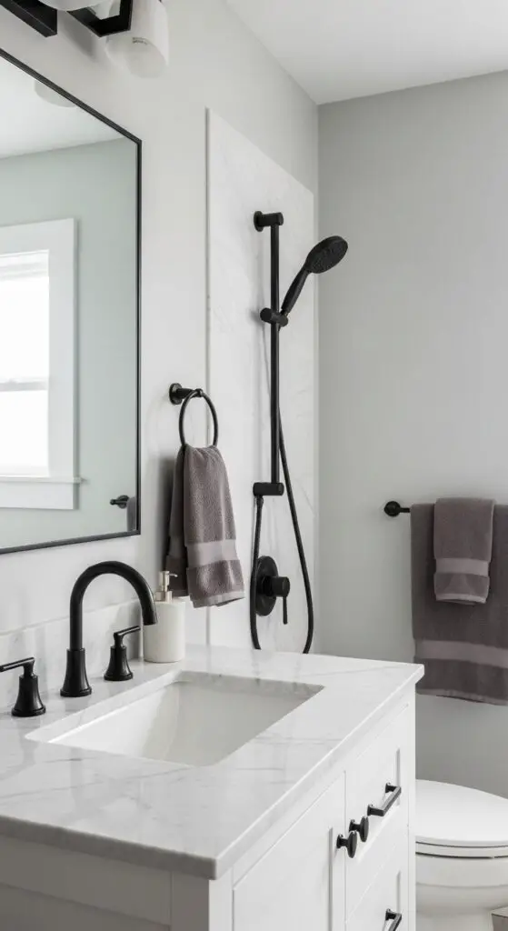 Matte black fixtures instantly change your guest bathroom from ordinary to extraordinary, modifying the sophisticated edge that defines contemporary design. You’ll create visual impact when you install a matte black faucet that contrasts beautifully against white marble or light-colored vanities. The dark finish adds depth while maintaining clean lines essential for modern aesthetics.
