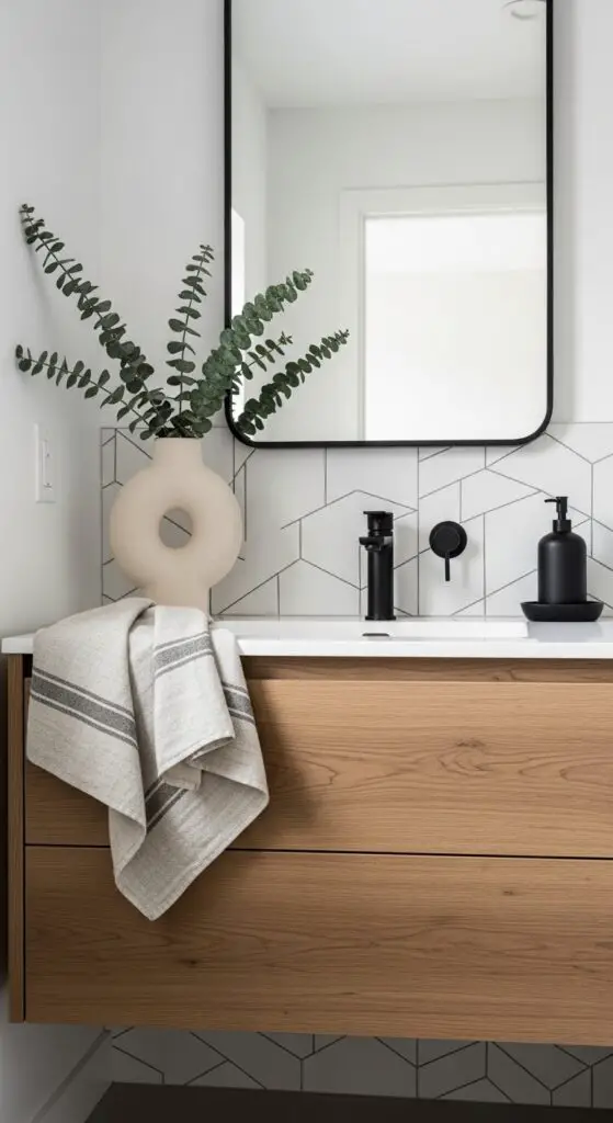A single sculptural vase with dried eucalyptus adds organic warmth while maintaining clean lines. Emphasize textures through one luxurious hand towel in rich linen or waffle weave that doubles as visual interest and functionality. Position a sleek soap dispenser in matte black or brushed brass to complement your fixture finishes.