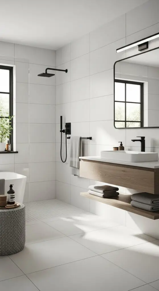 Consider varied tile sizes strategically—use larger formats on main surfaces while incorporating smaller accent tiles for visual interest. Choose coordinating grout colors that blend seamlessly with your tile selection. Light gray grout with white tiles maintains the clean look, while darker grout creates subtle definition without disrupting the streamlined appearance.