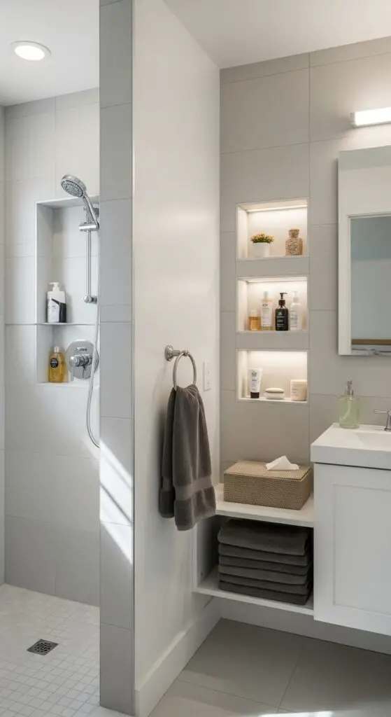 When you’re planning your modern guest bathroom renovation, built-in niches offer the perfect solution for maintaining clean lines while maximizing functionality. These recessed shelves create seamless storage that doesn’t protrude into your space, keeping the room feeling open and uncluttered.