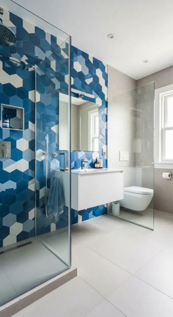 Consider hexagonal mosaics in vibrant blues or playful triangle arrangements that add movement to walls. Gradient effects offer another variable option, shifting from deep ocean blues to soft sky tones or sunny yellows to warm oranges. These ombré designs create depth without overwhelming smaller spaces.