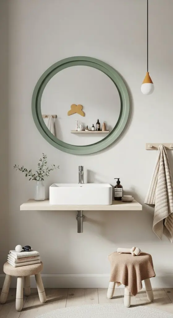 Round mirrors with colorful frames instantly soften harsh bathroom lines while creating a playful focal point that captivates young imaginations. You’ll uncover endless possibilities when exploring custom shapes that reflect your child’s personality and interests. Consider cloud-shaped mirrors for dreamy atmospheres or geometric hexagons for modern appeal.