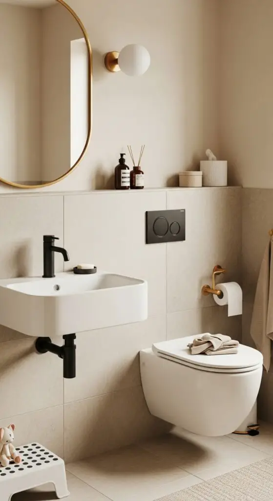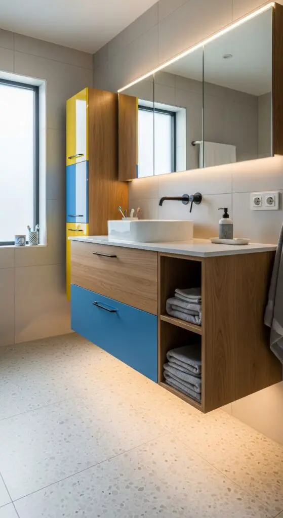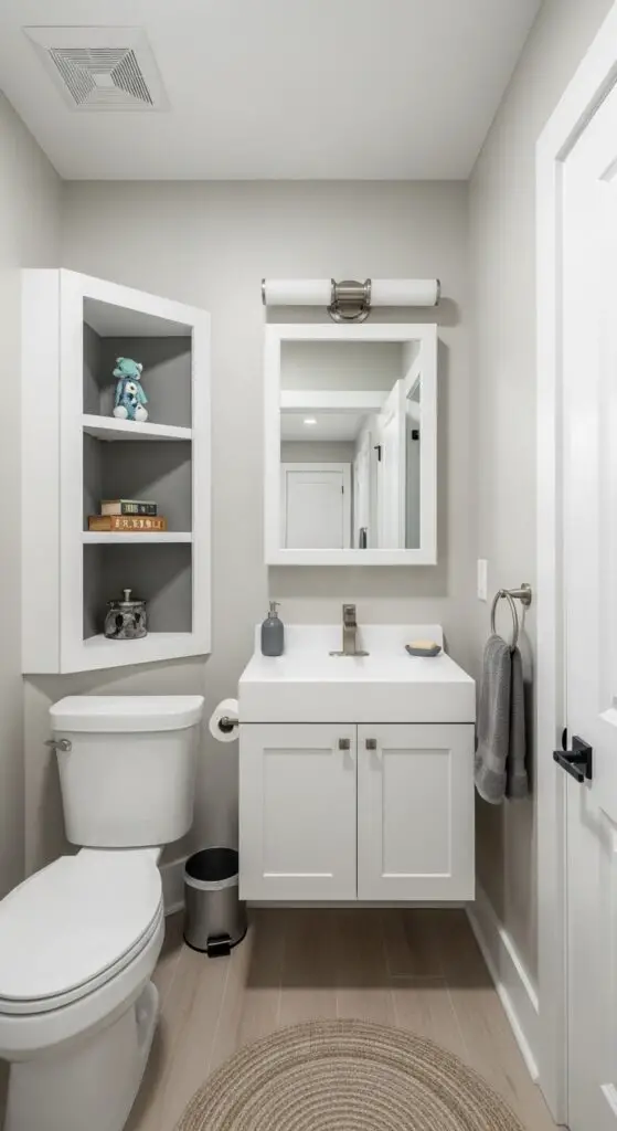 Multipurpose storage pieces work double duty in compact spaces. Choose ottomans with hidden compartments for towel storage, or select mirrors with built-in shelving behind the glass. Wall-mounted cabinets disguised as decorative panels keep toiletries organized while preserving your bathroom’s streamlined appearance and functionality. Implementing smart storage ideas specifically designed for children’s bathrooms helps maintain a clutter-free environment while keeping daily necessities easily accessible.