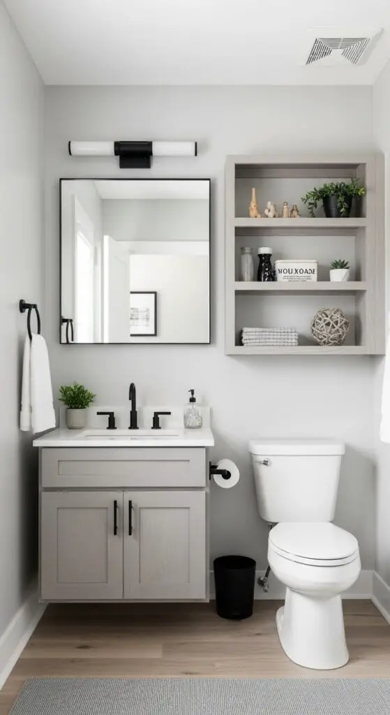 Efficient storage layouts include corner-mounted shelving units and recessed medicine cabinets that don’t protrude into walking areas. You can install multipurpose furniture solutions like storage ottomans that double as seating or step stools with hidden compartments underneath.