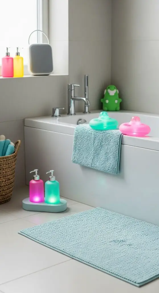 Include practical interactive features like colorful soap dispensers, fun-shaped washcloths, or textured bath mats that provide sensory stimulation while maintaining safety standards.