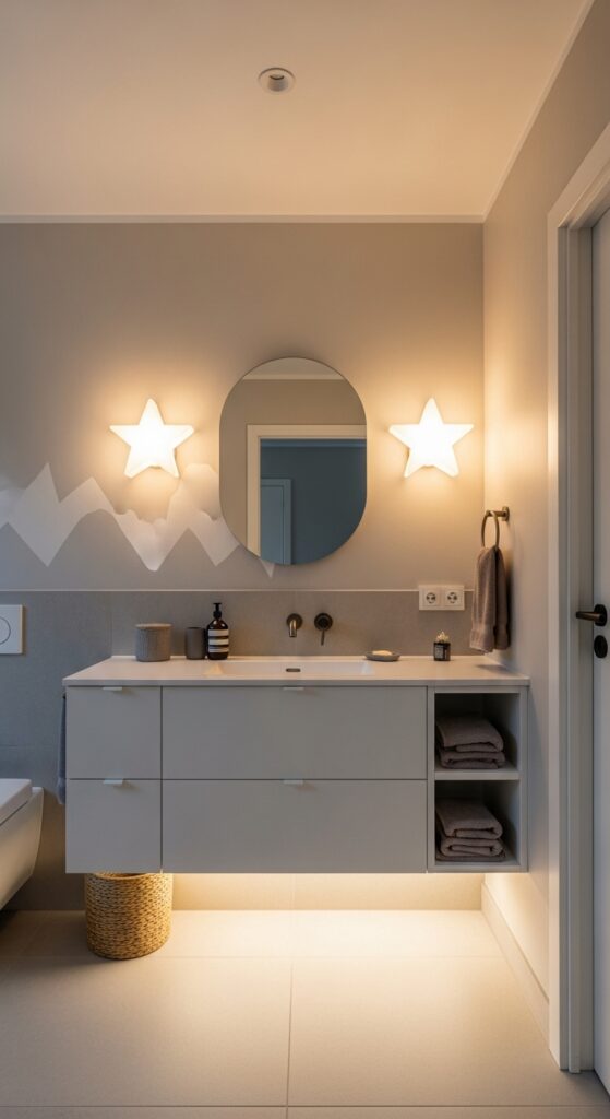 Sculptural pendants featuring geometric designs or nature-inspired forms serve dual purposes as functional fixtures and artistic focal points. Install dimmable LED options to adjust brightness levels throughout different activities. Consider rope lights around mirrors or under floating vanities for gentle accent illumination that won’t overwhelm young eyes during nighttime visits.