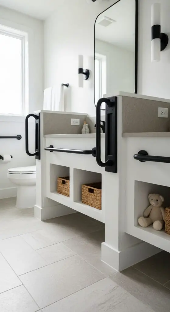Install grab bars that match your faucet finishes, creating cohesive design elements rather than obvious safety additions. Recessed storage cubbies eliminate sharp corners while keeping toiletries organized and accessible.